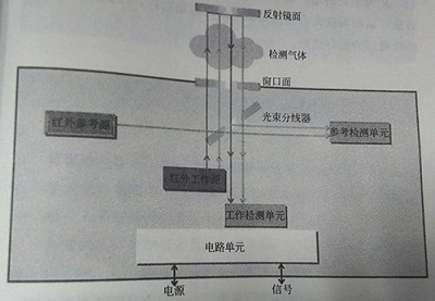 如上圖所示,這是一種采用了通過加熱反射鏡面來減少濕度對氣體傳感器檢測精度影響,雙光路的設計降低靈敏度變化的紅外傳感器。其所有檢測電路、光源和檢測器都被放置在真空密封的一個空間里面,避免了這個氣體檢測儀測量結果不會受到環境中灰塵和濕度的影響。所有參比光束和檢測光束都要通過一個窗口來進入開放式氣體檢測室,再通過鏡面反射進入窗口,完成兩次吸收后光束再回到密封光路中,最后再計算可燃氣體的濃度。需要  注意的是,這個設計中的窗口和反射鏡采用的加熱設計是為了防止檢測結果受到環境中的濕度影響。